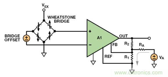 例如,在各元件的容差均為 0.1%且激勵電壓為 5 V 時,差分失調(diào)可以高達(dá)±5 mV。如果需要 400 的增益來實現(xiàn)所需電橋靈敏度,則放大器輸出端的失調(diào)變成±2 V。假設(shè)放大器由同一電源驅(qū)動,并且其輸出可以軌到軌擺動,則僅電橋失調(diào)就可能消耗掉 80%以上的輸出擺幅。在行業(yè)要求電源電壓越來越小的趨勢下,這個問題只會變得更加糟糕。