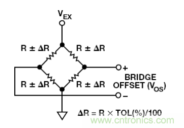 惠斯登電橋是這種情況的經(jīng)典例子,但像生物傳感器一類的原電池具有類似的特性。電橋輸出信號為差分信號,因此,儀表放大器是高精度測量的首選。理想情況下,無負(fù)載電橋輸出為零,但僅當(dāng)所有四個電阻均完全相同時,這種情況方為真。假如有一個以分立式電阻構(gòu)建的電橋,如圖 1 所示。最差情況差分失調(diào) VOS 為: