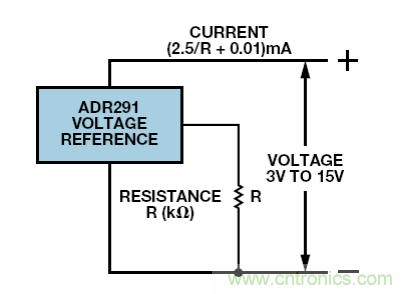 目前為止,我們討論的電路都是具有精密電流輸出的放大器。當然,它們能夠與固定輸入一同使用,提供精密電流源,但構(gòu)建一個更簡單的雙端電流源也是可行的。低電流基準電壓源ADR291 具有 10 μA左右的待機電流,典型溫度系數(shù)為 20nA/°C。如圖 11 所示,加入負載電阻后,則 3 V至 15 V電源范圍內(nèi)的基準電流為(2.5/R + 0.01) mA,其中R為負載電阻,單位是kΩ。