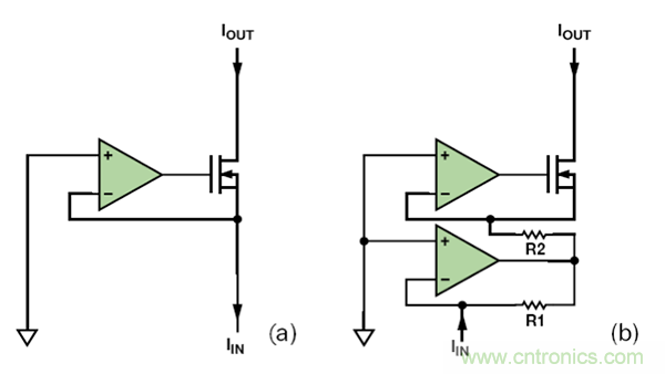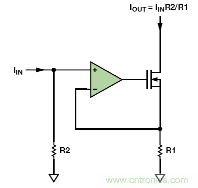 若單芯片IC中需要用到電流鏡,則最好使用簡單的晶體管電流鏡。然而,若采用分立式電路,其匹配電阻高昂的價格(價格高是因為需求量有限,而非制造困難)將使圖 5 中的運算放大器電流鏡成為最便宜的技術。該電流鏡由跨導放大器和一個額外的電阻組成。