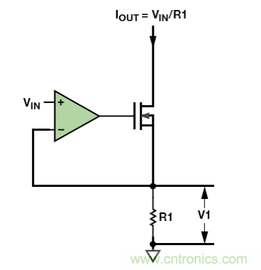 該電路簡單、價格不高。MOSFET柵極上的電壓可設置MOSFET中的電流和R1,使R1 上的電壓V1 等于輸入電壓VIN。