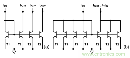 圖2. (a) 多級電流鏡 (b) 非整數(shù)比例電流鏡可將 3 個 T2 集電極結(jié)合起來,得到 3IIN