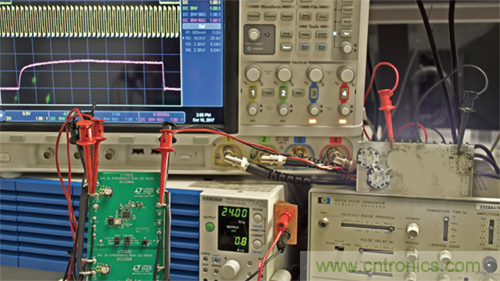 LT3932演示電路(DC2286A)設(shè)計為通過一個或兩個LED(作為降壓LED驅(qū)動器)驅(qū)動1 A的LED電流。如圖1所示,它很容易進行更改和并聯(lián),以實現(xiàn)更高電流、更高電壓或并聯(lián)運行。圖4顯示了如何將兩個這樣的電路輕松連接在一起,從24 V輸入以10μs、3 A脈沖驅(qū)動4個LED。出于測試目的,脈沖發(fā)生器可用于提供同步時鐘信號,如圖4所示。在量產(chǎn)機器視覺系統(tǒng)中,可利用時鐘芯片生成同步時鐘信號和PWM脈沖。如需更高電流脈沖,可使用相同的并聯(lián)方案添加更多演示電路DC2286A轉(zhuǎn)換器。