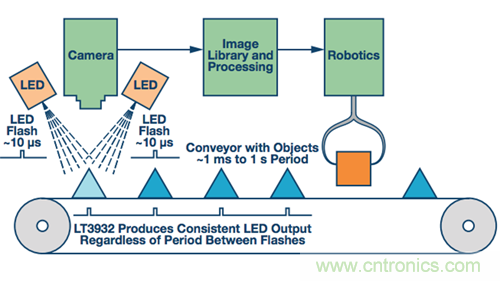 幸運的是,LT3932高速LED驅(qū)動器可為高達2 A的LED串提供機器視覺相機閃光燈,關(guān)斷時間可以長達1秒、1小時、1天或更長時間。LT3932的特殊相機閃光燈功能允許其保持輸出電容和控制環(huán)路充電狀態(tài),哪怕是在長關(guān)斷時間內(nèi)。對輸出和控制環(huán)路電容的狀態(tài)進行采樣后,LT3932繼續(xù)在長關(guān)斷期間對這些元件進行涓流充電,以補償通常都會有的漏電流,而這是其他LED驅(qū)動器未予考慮的。