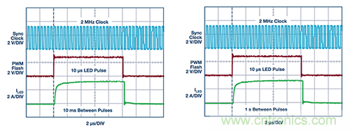 圖2. 無論PWM關(guān)斷時間是多少,圖1所示并聯(lián)LED驅(qū)動器的3 A相機閃光波形看起來相同。波形顯示,(a) 10 ms之后和(b) 1 s之后的10μs脈沖是相同的。經(jīng)過一天或更長的PWM關(guān)斷時間之后,LT3932 LED閃光波形看起來也相同。