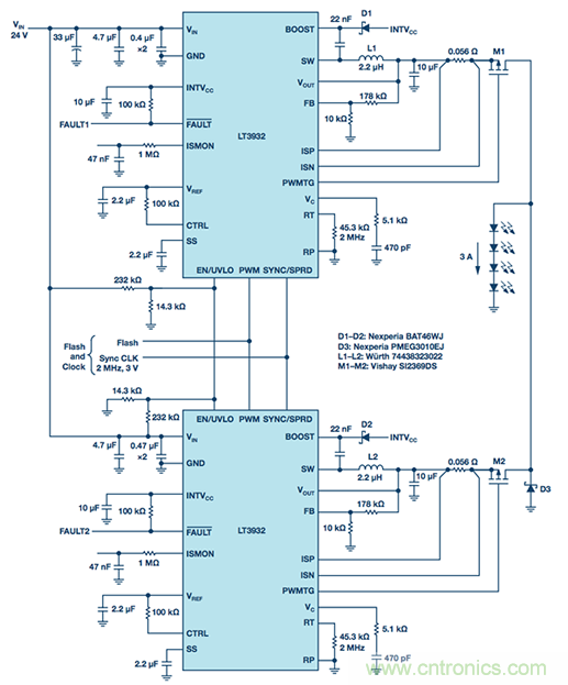 LT3932的專有閃光技術(shù)可以擴展,驅(qū)動器可以并聯(lián)以提供更高的LED閃光電流。所需的閃光形狀和完整性保持不變。圖1顯示了并聯(lián)兩個驅(qū)動器以支持3 A相機閃光燈是多么容易,高達4 A的設(shè)計也是可行的。