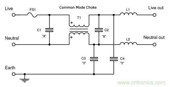 如圖3所示,薄膜電容器利用其自恢復和瞬態(tài)過壓能力,也可理想地用作X型和Y型電容器,分別降低差分模式和共模噪聲。安全級別的X1(4kV)或X2(2.5kV)電容器通過電源線連接,通常為聚丙烯類型,電容值通常為幾個μF,需要符合所適用的EMC標準。