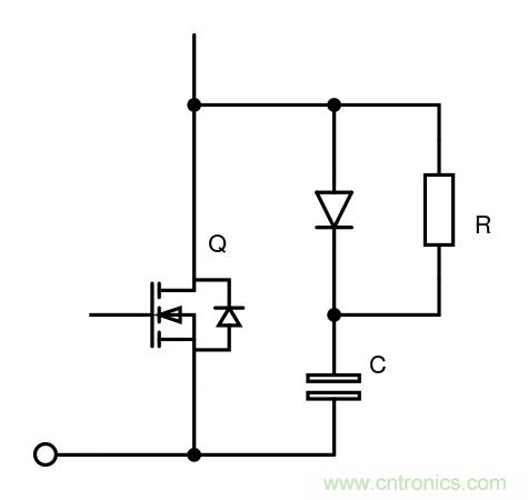 在開關緩沖電路中,電容器與電阻/二極管組合串聯(lián),并通過電源開關(通常為IGBT或MOSFET)連接,以控制dV/dt,如圖2所示。