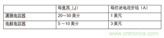 薄膜或電解電容器的相對成本可以從大容量存儲或處理波紋能力角度進行分析。如表2匯總的結(jié)果所示,2013年公布的數(shù)據(jù)1比較了由整流440VAC電源供電的直流總線典型成本: