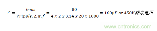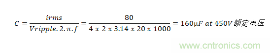 如果僅需要電容器來控制電動汽車動力系統(tǒng)等直流線路上的紋波電壓,則在選擇電容器時將會呈現(xiàn)顯著不同。 總線電壓可能與以前一樣為400V,但由采用電池供電,因此不存在穿越需求。在下游轉(zhuǎn)換器以20kHz的開關頻率提取80Arms脈沖電流時,將紋波限制在4Vrms以內(nèi)是非?,F(xiàn)實的, 所需的電容是:
