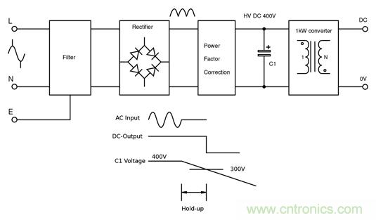 假設效率為90%,并且電壓降(Vd)為300V,低于該值,將會失去輸出調(diào)節(jié)功能。如果發(fā)生停電,當總線電壓從400V降至300V時,大容量電容器C1提供能量以保持恒定的輸出功率。 我們可以計算在電壓降至300V以下之前要進行20ms穿越所需的C1值: