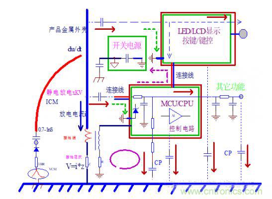1、靜電釋放于機(jī)殼,由于沒(méi)有理想的接地,會(huì)在機(jī)殼上建立電壓V。
