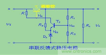 這種穩(wěn)壓電路的主回路由調(diào)整管T與負(fù)載相串聯(lián)構(gòu)成,且T工作在線性狀態(tài),故稱(chēng)為線性串聯(lián)式穩(wěn)壓電路。