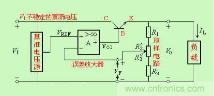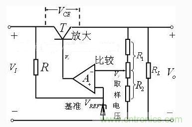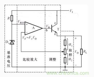 VI是整流濾波后的電壓,T為調(diào)整管,A為比較放大電路,VREF為基準(zhǔn)電壓,它由穩(wěn)壓管Dz與限流電阻R構(gòu)成。R1與R2組成反饋網(wǎng)絡(luò),是用來(lái)反映輸出電壓變化的取樣環(huán)節(jié)。