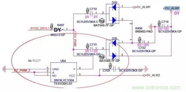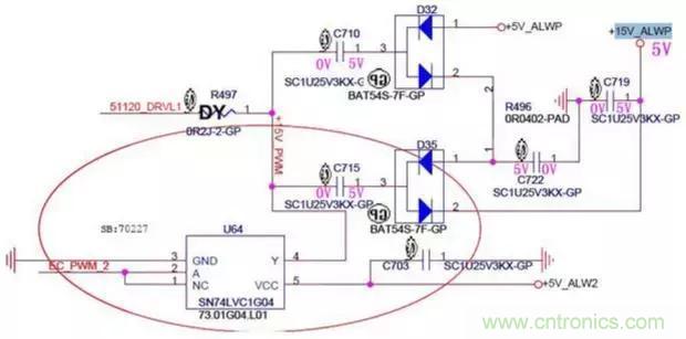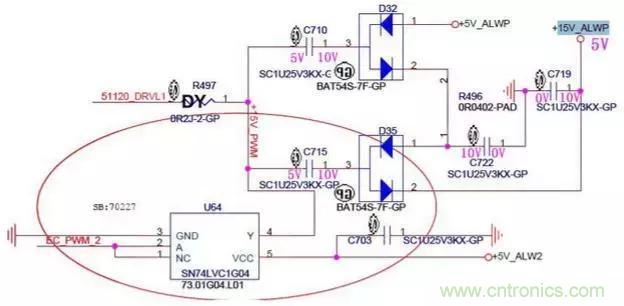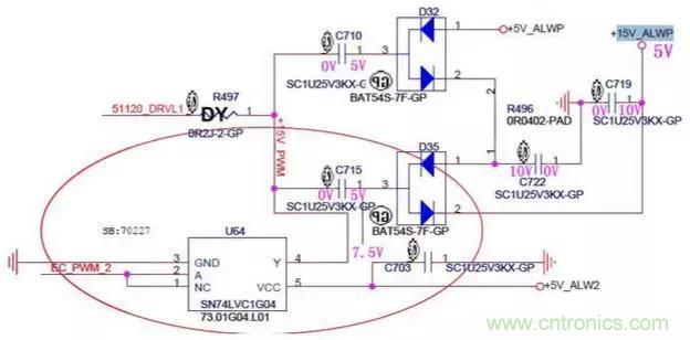 1.由于電容兩端的電壓不能突變,此時C715兩端的電壓為左邊5V,右邊為10V,然后電流經(jīng)過D35的2引腳對C719電容充電,充完電后C719的電壓升到了10V。