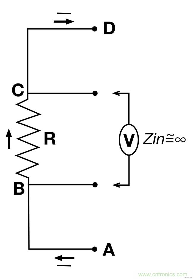 原則上借助電阻(“R”)和相應(yīng)的壓降(“V”,從B到C)來測(cè)量電流(I,從A到D)是非常簡(jiǎn)單的,但是有一些細(xì)小的問題要承認(rèn),當(dāng)電流很高而且電阻阻值為100 mΩ或者更低時(shí)我們要采用四線高阻抗開爾文感應(yīng)檢測(cè)法則。