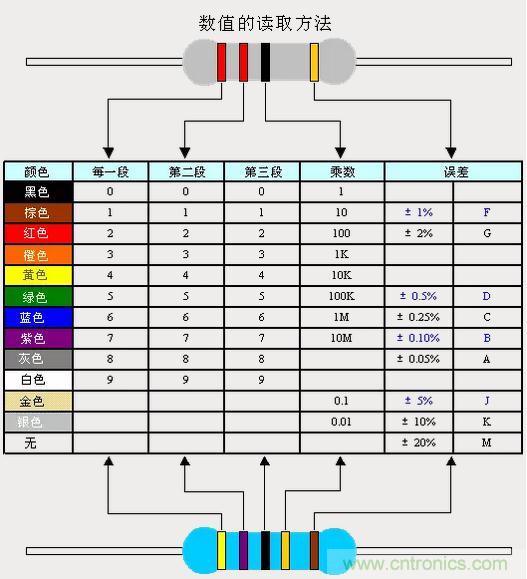 4、色標法:用不同顏色的帶或點在電阻器表面標出標稱阻值和允許偏差。國外電阻大部分采用色標法。