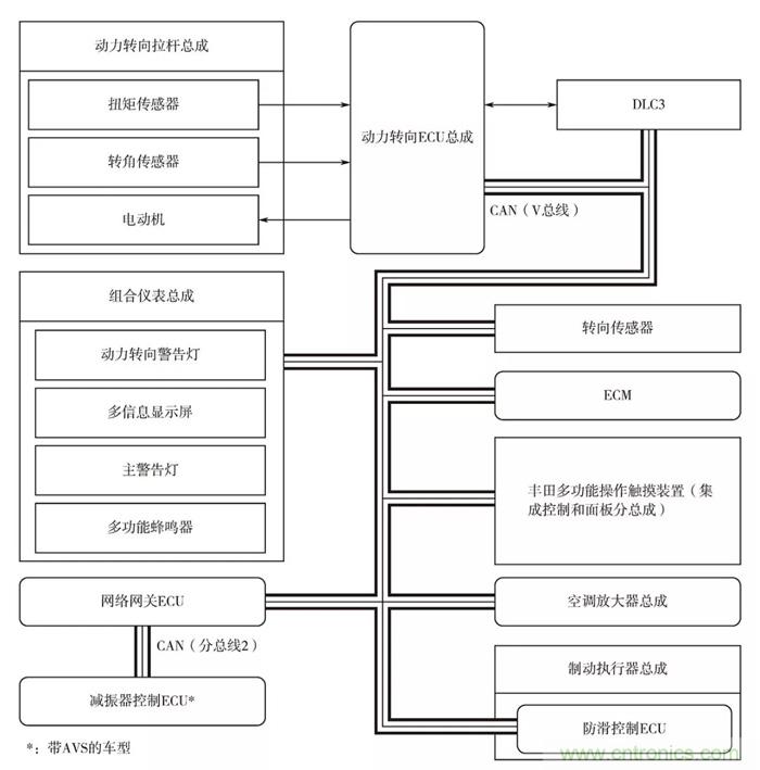 在分析方框圖了解信號或電流傳輸過程時,應(yīng)認(rèn)真查看圖中的箭頭方向,箭頭方向表示信號的傳輸方向。如果沒有箭頭方向,則可根據(jù)方框圖的圖形符號來判斷。箭頭如果是雙向的,表示信號既能輸入也能輸出;方框圖中粗線條表示CAN總線,下圖所示為2016 款皇冠EPS系統(tǒng)方框圖(系統(tǒng)圖)。對方框圖有整體的了解后,應(yīng)進一步弄清系統(tǒng)(整車或系統(tǒng))共有幾個框(多少部件),框與框之間存在何種關(guān)系,再對照電路原理圖,就可以對電路理解得更為深刻。