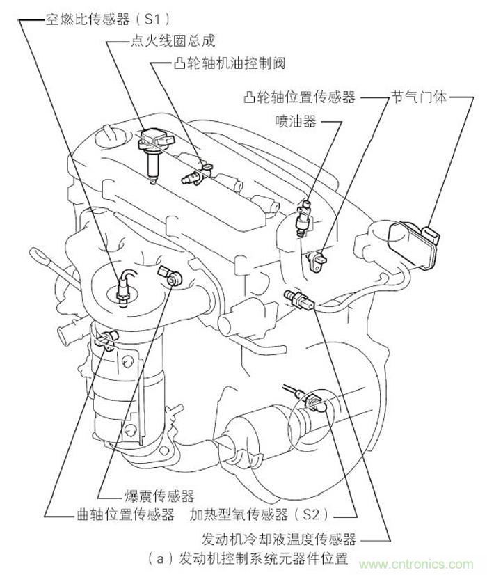 汽車元器件布置圖與汽車線束圖類似,標(biāo)注了電控系統(tǒng)傳感器、執(zhí)行器在汽車上的安裝位置,布置圖和線束圖、電路圖配合使用可以在實際維修中快速定位傳感器、執(zhí)行器、繼電器、熔絲等的詳細(xì)位置,再配合插腳圖能更加準(zhǔn)確快捷地定位故障元件。下圖為發(fā)動機控制系統(tǒng)元器件位置以及熔絲、繼電器安裝位置。