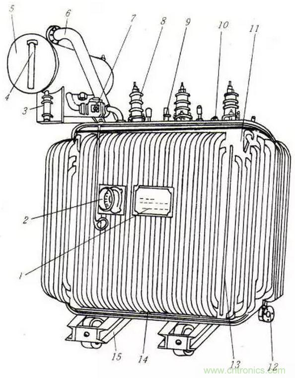 1-銘牌;2-信號(hào)式溫度計(jì);3-吸濕器;4-油標(biāo);5-儲(chǔ)油柜;6-安全氣道;7-氣體繼電器;8-高壓套管;9-低壓套管;10-分接開(kāi)關(guān);11-油箱;12-放油閥門(mén);13-器身;14-接地板;15-小車(chē);16壓力釋放閥(補(bǔ)充:圖左上側(cè))
