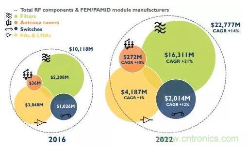 2016~2022年手機射頻前端模塊和組件市場