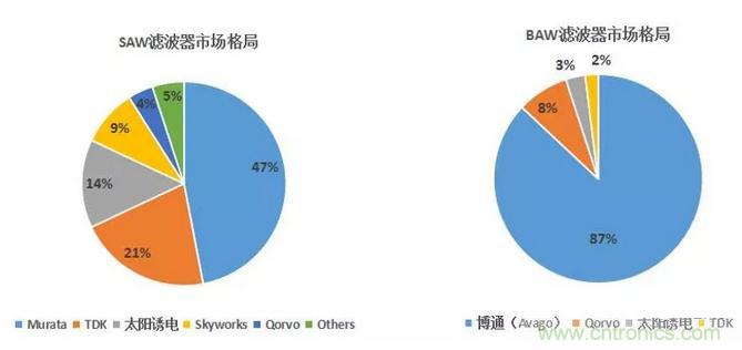 從全球范圍來看,SAW濾波器的主要供應(yīng)商包括TDK-EPCOS、Murata(村田)和太陽誘電,三者合計占據(jù)了全球82%的市場份額。BAW濾波器的主要供應(yīng)商包括Avago及Qorvo(Triquint),兩者占據(jù)了全球95%以上的市場份額。