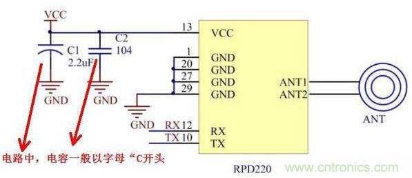 電容在電路中的標識一般以字母“C”開頭,在“C”的后面敷以數(shù)字,以表示電容在電路中的序號,例如圖中的C103,C104.就是指這個電路中的第103個,104個電容。