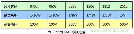 同樣,耐壓值選擇不合適的情況下,也會因為電阻被擊穿而導致系統(tǒng)設計的失敗。舉個例子:AC-DC開關(guān)電源模塊在設計的輸入前端,根據(jù)安規(guī) GB4943.1標準的要求,在保證插頭或連接器斷開后,在輸入端L、N上的滯留電壓在1S之內(nèi)衰減到初始值的37%,因此,在設計時一般會采用并接一個 或兩個MΩ級阻抗的電阻進行能量泄放,而輸入端是高壓,即電阻兩端是要承受高壓的,當電阻的耐壓值低壓輸入端高壓的情況下,就會產(chǎn)生失效。以下表一是常見SMT厚膜電阻的參數(shù),最終選型時還要和選購器件的廠家核實。