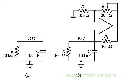 無論怎樣選擇R和C的值,該電路的極點將始終為負。我們希望找到控制它的方法,以便將其驅動為零甚至使其成為正的。圖5b示出的電路可以完成這項工作。非反相放大器檢測vn并輸出電壓: