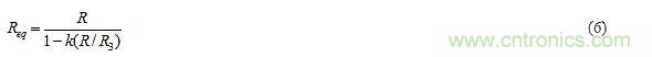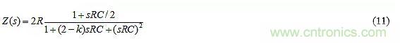 其中R2代表電位器在其左端和游標之間的部分。對于給定的元件值,從左端到右端改變游標將使k在0<k<2的范圍內(nèi)變化?,F(xiàn)在,R3上的電壓為(1+k)vn–vn,即kvn,在右邊是正的,表明R3將為C提供電流kvn/R3。鑒于R從C中汲取電流vn/R,因此從C流出的凈電流為iC=vn[1/R+1/(-R3/k)],表明C視R與一個負電阻–R3/k并聯(lián),凈等效電阻Req=R||(–R3/k)]。擴展后可以得到: