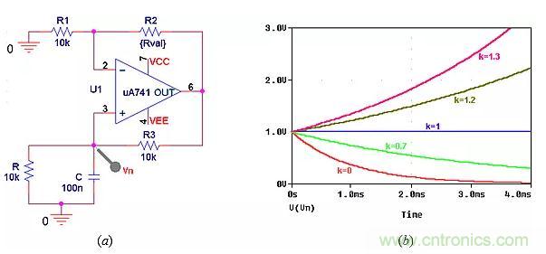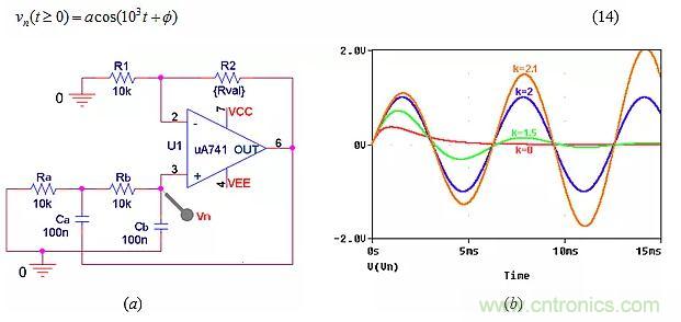 ● 將k提高到2以上,使運算放大器注入的能量超過端口電阻可以消耗的能量,引起發(fā)散振蕩,如圖9b中k=2.1所示。振蕩將持續(xù)增長到運算放大器飽和為止。