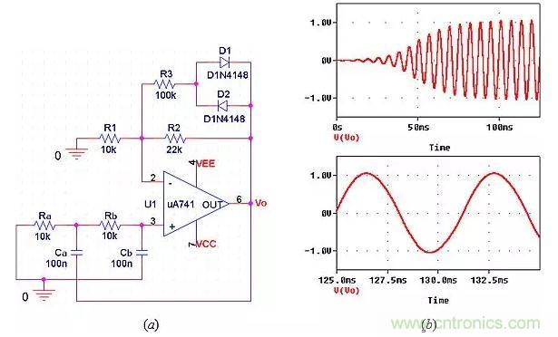 在圖11a中,電源接通時,兩個二極管仍然關閉,因此k=R2/R1=22/10=2.2,表明振蕩增加。隨著振蕩的增加,二極管在交替的半周期內(nèi)逐漸導通,所以k=[R2||(R3+rd)]/R1,其中rd是動態(tài)二極管電阻(rd隨二極管電流而減小)。在rd<<R3的極限情況下,我們將得到k=(22||100)/10=1.8,表示電路可在1.8<k<2.2的范圍內(nèi)調整k的值,這包括k=2.0時持續(xù)振蕩達到所需幅度的情況。