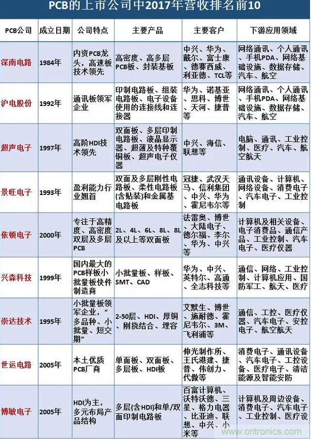 深南電路:成立于1984年,內(nèi)資PCB龍頭。擁有印制電路板、封裝基板及電子裝聯(lián)三項(xiàng)業(yè)務(wù)。公司在高密度、高多層PCB板產(chǎn)品方面具有顯著優(yōu)勢(shì),可實(shí)現(xiàn)最高100層、厚徑比30:1等產(chǎn)品。下游通信領(lǐng)域營(yíng)收占比突出,2017年?duì)I收占比超60%。