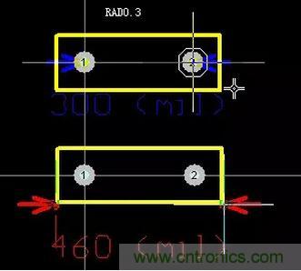 無極電容封裝以RAD標識,有RAD-0.1、RAD-0.2、RAD-0.3、RAD-0.4,后面的數(shù)字表示焊盤中心孔間距,如下圖所示(示例RAD-0.3)