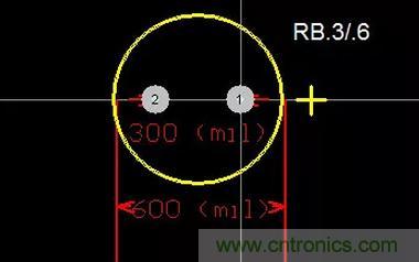 電解電容封裝則以RB標識,常見封裝有:RB.2/.4、RB.3/.6、RB.4/.8、RB.5/1.0,符號中前面數(shù)字表示焊盤中心孔間距,后面數(shù)字表示外圍尺寸(絲?。?,單位仍然是英寸,如下圖(RB-.3/.6):