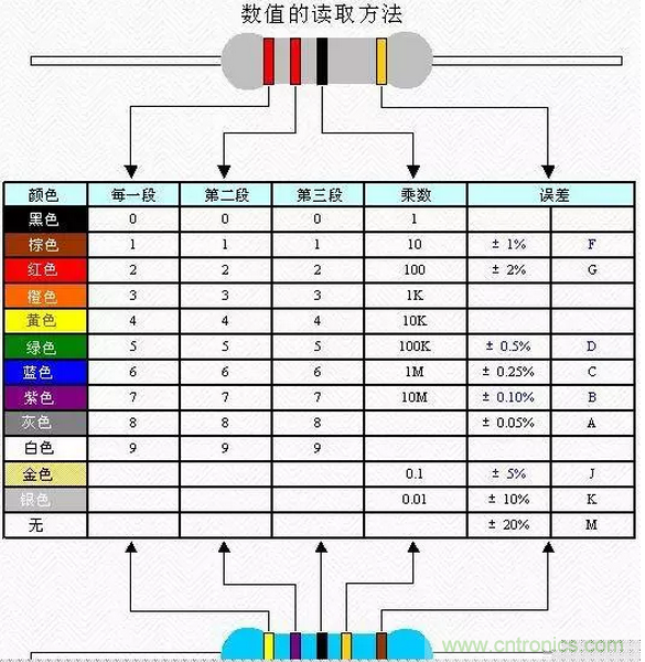 黑-0、棕-1、紅-2、橙-3、黃-4、綠-5、藍(lán)-6、紫-7、灰-8、白-9、金-±5%、銀-±10%、無色-±20%
