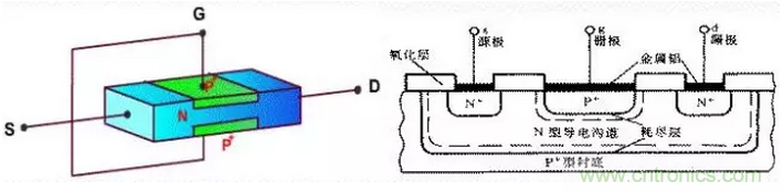 ※場效應(yīng)分類:場效應(yīng)管主要有結(jié)型場效應(yīng)管(JFET)和絕緣柵型場效應(yīng)管(IGFET)。絕緣柵型場效應(yīng)管的襯底(B)與源析(S)連在一起,它的三個極分別為柵極(G)、漏極(D)和源極(S)。晶體管分NPN和PNP管,它的三個極分別為基極(b)、集電極(c)、發(fā)射極(e)。場效應(yīng)管的G、D、S極與晶體管的b、c、e極有相似的功能。絕緣柵型效應(yīng)管和結(jié)型場效應(yīng)管的區(qū)別在于它們的導(dǎo)電機(jī)構(gòu)和電流控制原理根本不同,結(jié)型管是利用耗盡區(qū)的寬度變化來改變導(dǎo)電溝道的寬窄以便控制漏極電流,絕緣柵型場效應(yīng)管則是用半導(dǎo)體表面的電場效應(yīng)、電感應(yīng)電荷的多少去改變導(dǎo)電溝道來控制電流。它們性質(zhì)的差異使結(jié)型場效應(yīng)管往往運(yùn)用在功放輸入級(前級),絕緣柵型場效應(yīng)管則用在功放末級(輸出級)。場效應(yīng)管的工作原理和三極管其本一樣,只是他們一個是壓控型元件,一個是電流控制元件,場效應(yīng)管只有一個PN結(jié),如圖所示1-1