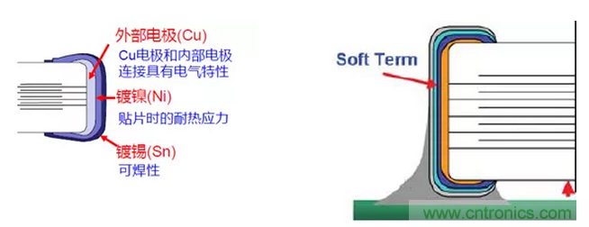 陶瓷電容主要由兩部分組成,陶瓷電容本體和外部電極組成。本體部分由內(nèi)部電極和介質(zhì)層組成,外部電極由銅鎳錫三層組成,柔性電容會(huì)在銅鎳之間多加一層Soft Term層,增加可靠性。