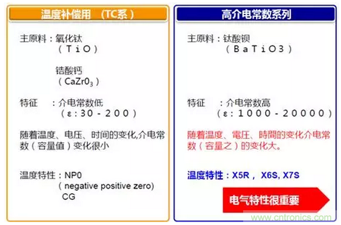 目前主流的陶瓷電容分類主要是按材質(zhì)來分,不同的材質(zhì),會(huì)有不同的容值,有不同的溫度系數(shù)。目前主要有以下材質(zhì):X5R,X7R,C0G,NP0,X6S,X7T等,這些又可以分兩大類,溫度補(bǔ)償型和高介電常數(shù),主要是溫度系數(shù)不同,溫度補(bǔ)償型主要是容值隨溫度變化小,但是容值做不高。高介電常數(shù)型,溫度系數(shù)不好,但是容值可以做的比較高。