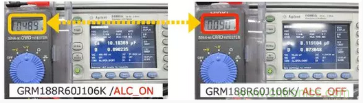 大容量和非大容量MLCC在ALC (Automatic Level Control )ON/OFF的狀態(tài)下測(cè)定靜電容量。結(jié)果如下。