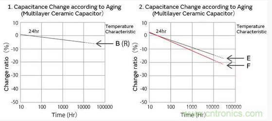 高誘電系的積層陶瓷電容器的靜電容量,以經(jīng)過125℃以上的熱處理24小時(shí)后的值作為基準(zhǔn),與時(shí)間成對(duì)數(shù)關(guān)系直線性下降。請(qǐng)參考如下本公司制品靜電容量老化特性的代表例子。