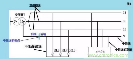 我們再來看圖1。圖1中的中性線發(fā)生了斷裂,于是在斷裂點(diǎn)的前方,中性線的電壓依舊為零,但斷裂點(diǎn)的后方若三相平衡時,它的電壓為零;但若三相不平衡,則斷裂點(diǎn)后方的中性線電壓會上升,最高會升到相電壓。