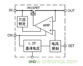 AAT4610將6V/2A的P溝道MOSFET場(chǎng)效應(yīng)管與柵極驅(qū)動(dòng)器、電壓基準(zhǔn)、限流比較器和欠壓閉鎖電路組合在SOT-23-5封裝中(如圖2)。其中MOSFET是一個(gè)電子開關(guān),它的通斷受比較器輸出電壓的控制,如果輸出電流大于設(shè)定電流,運(yùn)算放大器AMP輸出負(fù)電壓,關(guān)斷MOSFET,停止電壓輸出,對(duì)供電電路起到保護(hù)作用。MOSFET的溝道電阻最大值僅為180mΩ,關(guān)斷模式下靜態(tài)電流為1mA。MOSFET的工作電壓為2.7V~5.5V,輸入電壓低于2.7V時(shí),由欠壓鎖定電路關(guān)斷MOSFET,對(duì)供電電路進(jìn)行欠壓保護(hù)。