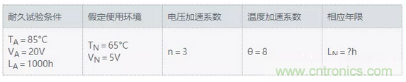 在此,我們一起來比較一下陶瓷電容器的加速試驗(yàn)與實(shí)際產(chǎn)品使用的假定環(huán)境。我們將電容器的加速試驗(yàn)中將耐久試驗(yàn)時(shí)間視為L(zhǎng)A,將實(shí)際使用環(huán)境下的相當(dāng)年數(shù)視為L(zhǎng)N,用于上述公式。