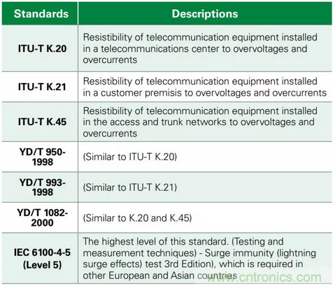 盡管客戶駐地設(shè)備(CPE)設(shè)計(jì)人員可采取三種基本的電路保護(hù)方案:氣體放電管(GDT)、瞬態(tài)電壓抑制(TVS)二極管陣列和保護(hù)型晶閘管,但他們所選擇的任何設(shè)備都必須使其設(shè)計(jì)最小程度地符合浪涌TIA-968B(以前稱為FCC第68部分)的要求。在美國,任何連接到公共交換電話網(wǎng)絡(luò)(PSTN)的通信設(shè)備均需具備此性能。其他國家也有類似要求,如表1所示。一些G.FAST供應(yīng)商可能會傾向于在美國市場采用符合GR-1089-Core的安全設(shè)計(jì)。