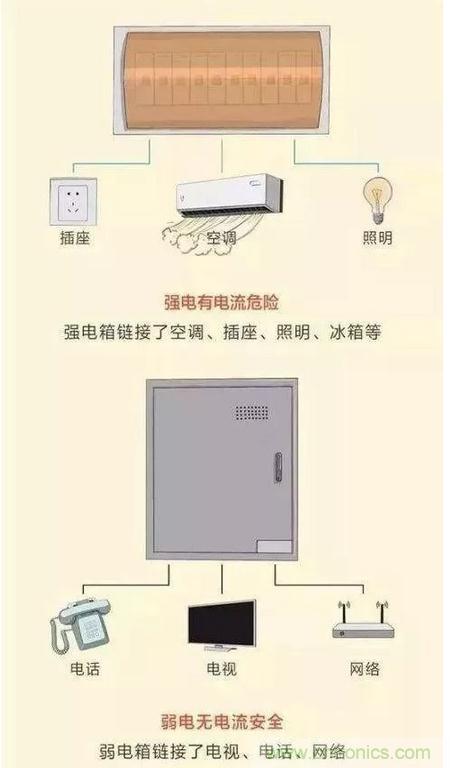 其中的強電是存在電流危險的,主要包括有空調(diào)、插座、照明、冰箱等;而弱電是沒有電流安全的,涵蓋了電視、電話、網(wǎng)絡(luò)。