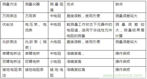 按所使用的儀表分類分為:萬(wàn)用表法、伏安法、兆歐表法、單臂電橋法、雙臂電橋法、接地電阻表法等。