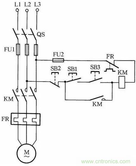圖中SB2為停止按鈕,在停止時(shí),按動(dòng)SB2的時(shí)間要長(zhǎng)一點(diǎn)。否則,手松開(kāi)按鈕后,接觸器又吸合,使電動(dòng)機(jī)繼續(xù)運(yùn)行。這是因?yàn)殡娫措妷弘m被切斷,但由于慣性的作用,電動(dòng)機(jī)轉(zhuǎn)子仍然轉(zhuǎn)動(dòng),其定子繞組會(huì)產(chǎn)生感應(yīng)電動(dòng)勢(shì),一旦停止按鈕很快復(fù)位,感應(yīng)電動(dòng)勢(shì)直接加在接觸器線圈上,使其再次吸合,電動(dòng)機(jī)繼續(xù)運(yùn)轉(zhuǎn)。