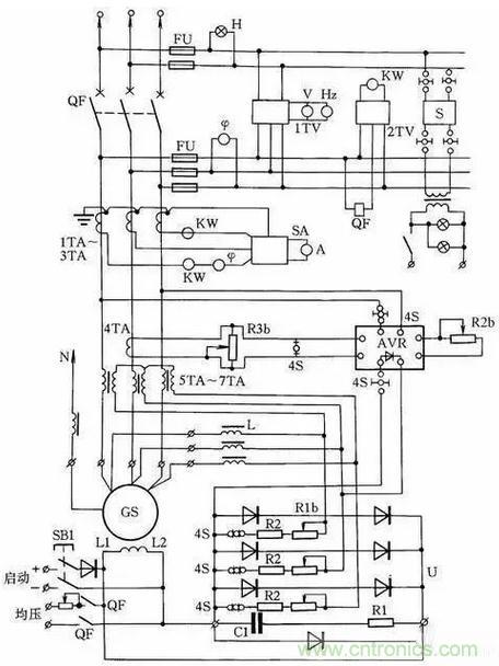 HF-4-81系列發(fā)電機(jī)控制線路如圖15所示,它與T2XV系列小型三相同步發(fā)電機(jī)配套。同步發(fā)電機(jī)的勵(lì)磁系統(tǒng)采用電復(fù)合相復(fù)勵(lì)調(diào)壓。發(fā)電機(jī)端電壓經(jīng)線性電抗器L移相,然后與發(fā)電機(jī)負(fù)荷電路中的電流互感器5TA~7TA二次電壓合成,經(jīng)三相橋式整流器整流后,供發(fā)電機(jī)GS勵(lì)磁自動(dòng)調(diào)壓。
