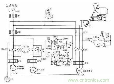 這時(shí)料斗已升到預(yù)定位置,把料自動(dòng)倒到攪拌機(jī)內(nèi),并自動(dòng)停止上升。此時(shí)操作人員按下下降按鈕2SBR時(shí),卷?yè)P(yáng)系統(tǒng)帶動(dòng)料斗下降,待下降到其料口與地面平齊時(shí),擋鐵碰撞行程開(kāi)關(guān)3SQ,使2KMR接觸器斷電釋放,自動(dòng)停止下降,為下次上料做好準(zhǔn)備,這時(shí)攪拌機(jī)料已備好,操作人員再按下3SB1,3KM接觸器得電吸合,使供水抽水泵電動(dòng)機(jī)3M運(yùn)轉(zhuǎn),向攪拌機(jī)內(nèi)供水,與此同時(shí),時(shí)間繼電器KT得電工作,待供水與原料成比例后(供水時(shí)間由KT時(shí)間繼電器調(diào)整確定,根據(jù)原料與水的配比確定),KT動(dòng)作延時(shí)結(jié)束,從而使3KM自動(dòng)釋放,供水停止。